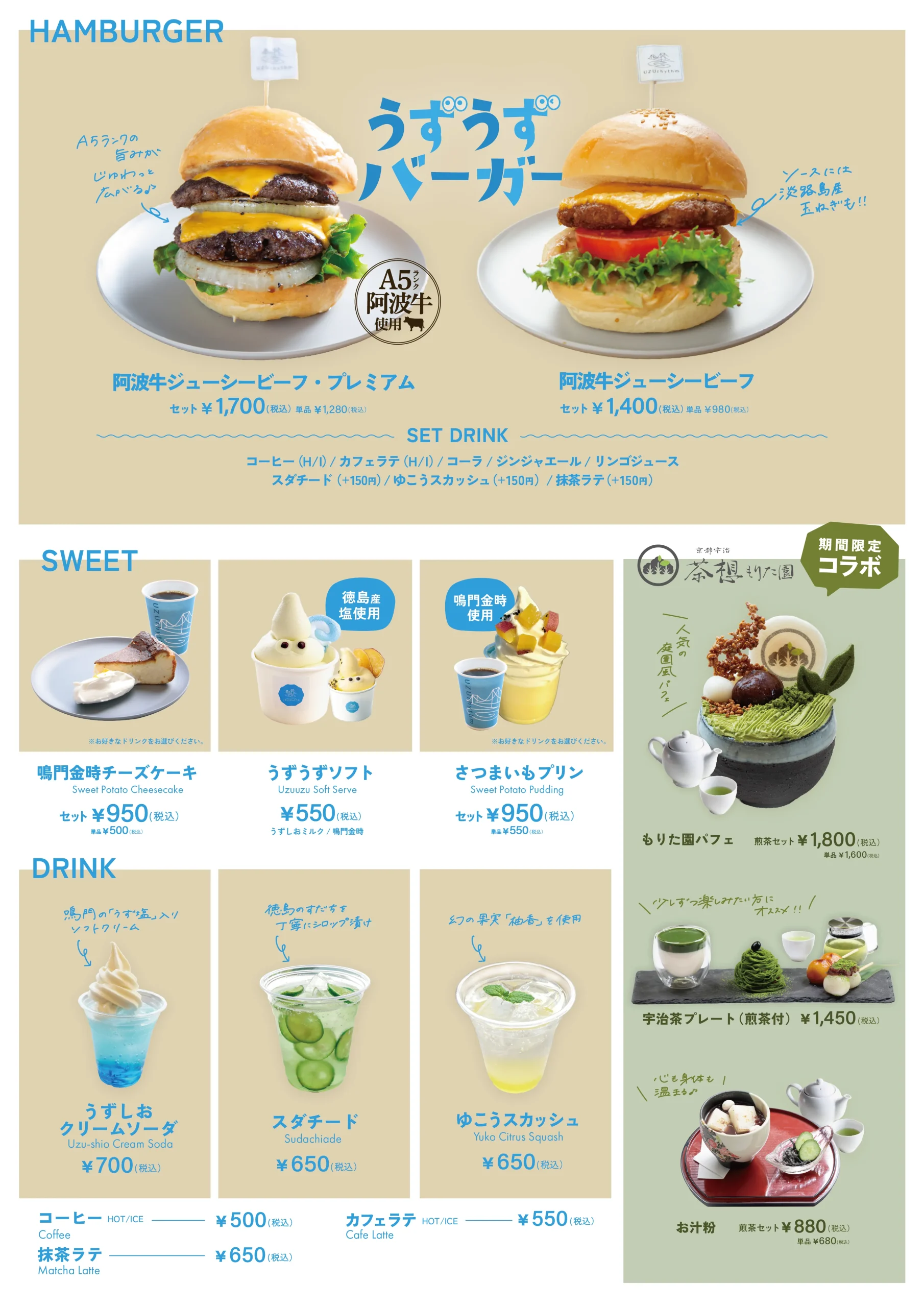 ウズリズムにて、徳島が誇る最高級ブランド牛「阿波牛(A5ランク)」を使用したハンバーガー 「阿波牛ジ…